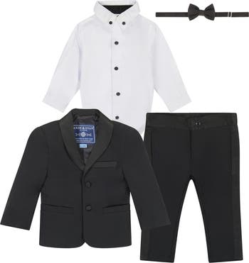 With smooth satin accents and welt pockets, this pintsize tuxedo will keep your baby looking suave and sophisticated. A crisp button-down bodysuit and a sharp bow tie complete the debonair look.