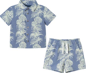 Keep baby comfy in this adorable two-piece set featuring a button-up shirt and drawstring-waist shorts patterned in soft stripes or tropical fronds.
