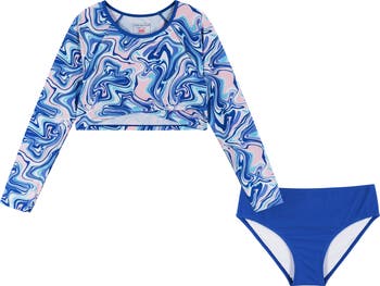 Your kiddo will swim sweetly in this printed rashguard set with built-in sun protection and matching bikini bottoms.