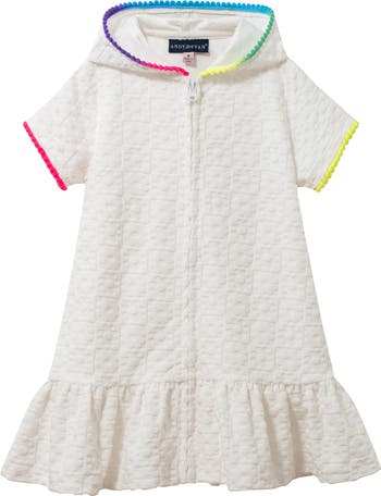 They'll love to lounge by the water in this terry cover-up dress featuring a tonal jacquard pattern and a sun-blocking hood.