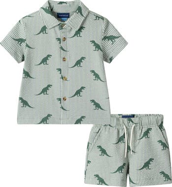 A playful print brings kid-approved style to this seersucker set that pairs a stretchy button-up shirt with matching shorts.