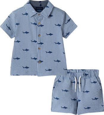 A playful print brings kid-approved style to this seersucker set that pairs a stretchy button-up shirt with matching shorts.