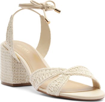 Woven raffia adds an earthy element to this block-heel sandal topped with a wraparound ankle strap.