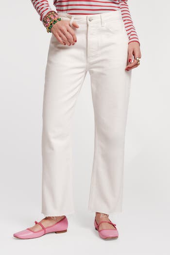 Straight-leg jeans with a frayed hem|cropped length|mid-waist rise|a button fly|classic 5-pocket styling