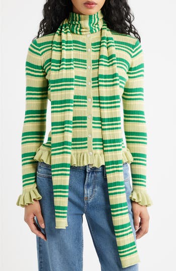A matching removable scarf gives you more ways to style this brightly striped merino-infused cardigan that's sweetened with pertly ruffled trim.