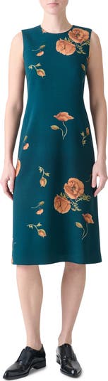The brand's beloved anemones bloom in a peachy hue gorgeously complemented by the teal background of this sleeveless sheath tailored from a double-face virgin wool blend.