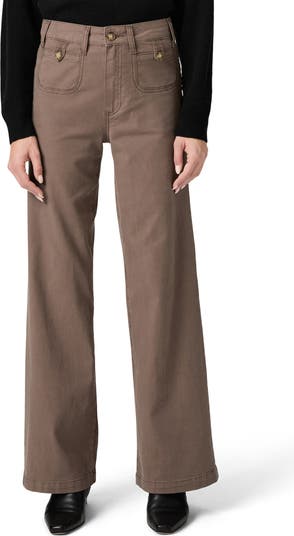 Slim through the thighs and wide through the legs, these full-length jeans stand out with rounded button pockets and a vintage-inspired taupe-brown hue.