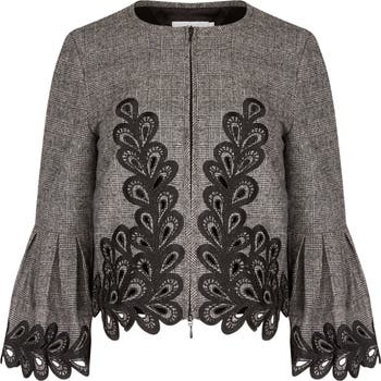 The Ange is a straight-cut, short designer jacket that brings refined structure and delicate artistry together in one effortlessly chic silhouette. Featuring a boxy shape and round neckline, this modern piece is finished with a hidden kissing zipper for a clean, polished look. Three-quarter-length sleeves fall straight before flaring into dramatic pleated ruffle cuffs, adding volume and a soft, feminine finish. Intricate leaf embroidery frames the front zipper, bottom hem, and ruffled sleeves, introducing a subtle decorative detail that enhances the jacket’s elegant composition. Perfect for layering over tailored looks or pairing with flowing separates, the Ange jacket offers timeless versatility with elevated design. More than a layering piece, the Ange designer jacket is a celebration of contrast – where crisp tailoring meets romantic embellishment in perfect harmony.