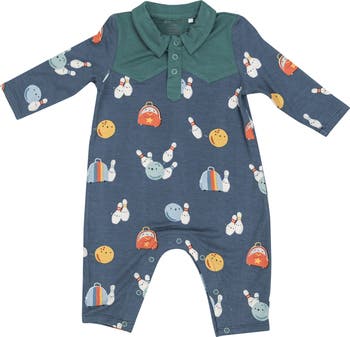 Bowling balls and pins help your little one score lots of comfort in a romper made of soft viscose with enhanced stretch and handy snaps for easy changing.