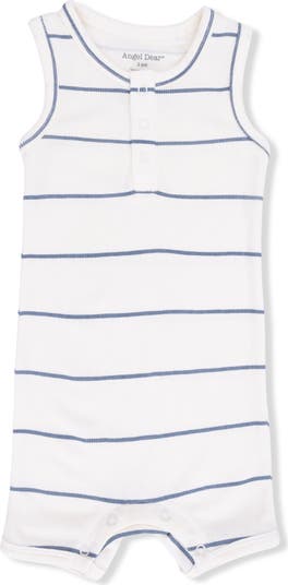 Soft stripes dart across this ribbed henley-style romper complete with snap-closure placket and snaps between the legs for easy diaper checks and changes.
