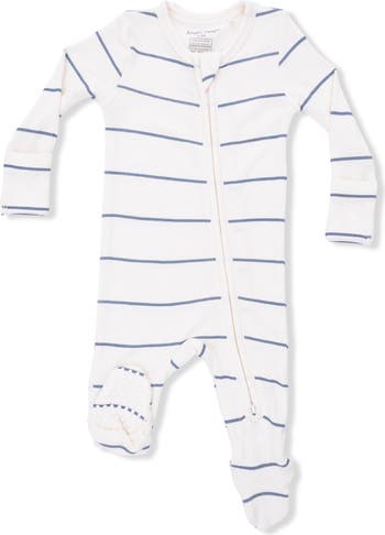 This soft and breathable modal-blend footie wrapped in stripes features two-way front-zip closure and foldover cuffs.