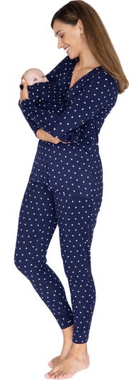 Stay comfortable as can be throughout every stage of pregnancy in bump-flattering pajamas made with a surplice neckline designed for nursing once baby arrives. It comes with a matching pouch to wrap baby in.