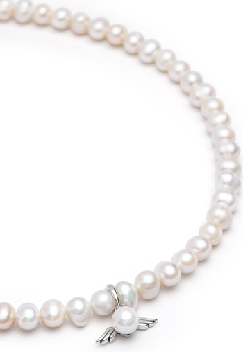 Strung by hand from baroque pearls, this delicate choker features an angel wing pendant and adds uniqueness to any look. Each piece is one of a kind with natural variation.
