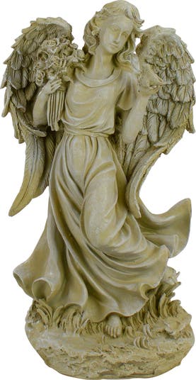Enhance your living space with this distressed angel garden statue with a bird and bouquet in a simple style that transforms any area into your blissful hideaway. Its life-like details add a natural flair to your decor wherever it is placed. This statue will impress your guests and is sure to deliver the magic. Product Features: Elegant angel outdoor garden statue Angel dressed in a long flowing gown Carrying a bouquet of flowers and a bird perched upon her hand Standing on a round base that looks like grass Meticulously sculpted by highly skilled artisans with fine attention to detail Comes with distressed almond finish Recommended for both indoor or outdoor use Dimensions: 17.5"H x 8.5"W x 7.5"D Material(s): polyresin