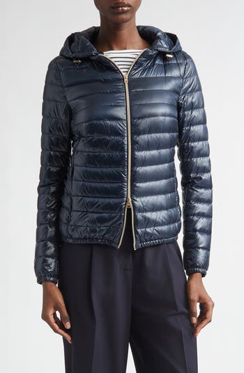 A golden coil zipper pops at the front of this lightweight down-filled puffer jacket cut from the brand's silky nylon and equipped with a drawcord-toggle hood.