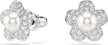 Evoking the beauty of nature in rhodium plating, these stud earrings feature delicate flowers, each made with a faux-pearl center and pavé petals.