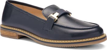 Geometric hardware at the instep enhances the timeless sophistication of this luxe leather loafer set on a cushioned, arch-supporting footbed and a flexible sole.