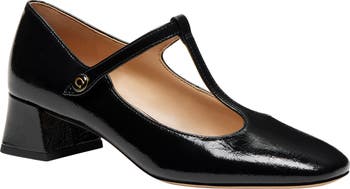 A slender T-strap offers a secure fit and retro aesthetic on a square-toe pump featuring a luminous leather upper and lifted by a wrapped block heel.