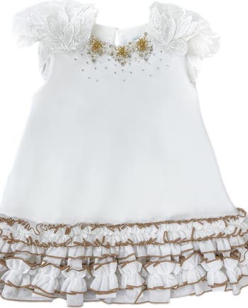 White couture dress with hand beading, satin back bow with a faux pearl center and gorgeous fitted bodice that flares out to layers of ruffle skirts.