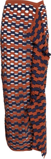 Knit from silky yarns, this skirt with a dramatically draped silhouette speaks Henry Zankov's visual language of bold color/pattern play with an openwork design that flirts with light and skin.