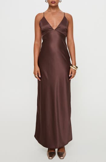 Smooth satin brings a graceful drape to a softly smoldering gown designed with a dipped neckline and a strappy open back.