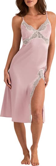 The Angie slip features lace-lined triangle cups, a midi length skirt, fully adjustable straps, and a sexy leg slit.