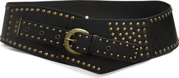 Designed to sit at the waist, this superwide faux-leather belt features edgy studded details and an asymmetric design.
