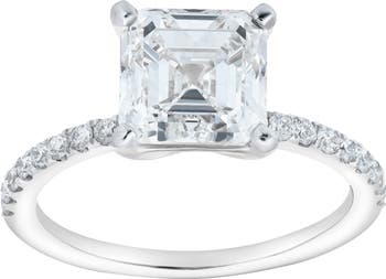 An elegant 2.7 carat Emerald Cut lab grown diamond ring encased in a beautifully crafted 14K gold prong setting with round cut lab grown side diamonds. The ring is accompanied with an IGI certificate with the certificate number inscribed within the band. Diamond carat weight may fluctuate 0.05 carats ABOVE the stated number.