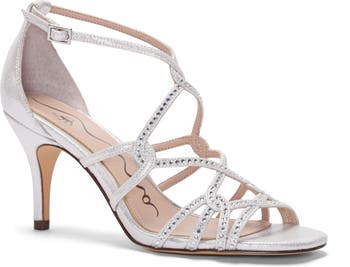 Rhinestone-encrusted straps stylishly interlock on a soirée-ready sandal lifted by a svelte heel and secured with an adjustable buckle closure.