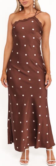 Lovely lace trims the shoulder-baring neckline of this glossy satin maxi made with slinky adjustable straps and sprinkled with celebratory dots.