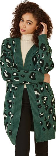 Stand out this season in this stunning Yumi Animal Intarsia Long Cardigan. Timeless animal print in an on-trend color. This piece is knitted using the intarsia technique, features ribbed edging and roomy pockets. Perfect for layering - because warm shouldn't have to mean boring.