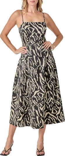 Bold animal stripes add unmistakable exotic style to a scene-stealing midi dress in a classic A-line silhouette.