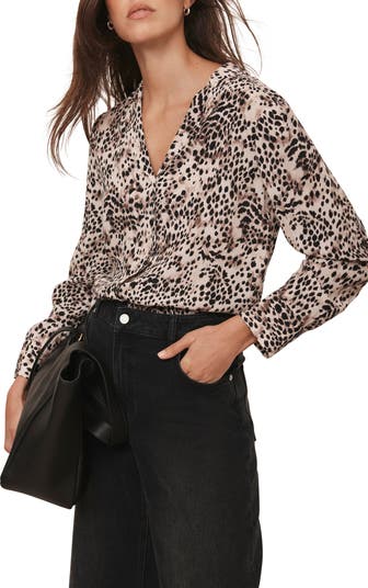 Animal print shirt featuring a V-neckline, peaked lapels, long sleeves, buttoned cuffs with a button fastening through the front.