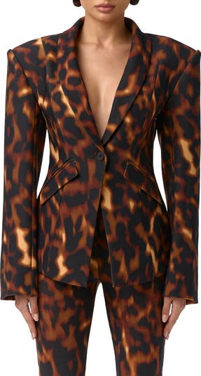 A blurred-out animal print patterns this structured blazer with elongated padded shoulders and a single-button closure.