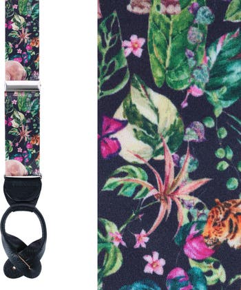 These fun jungle themed suspenders are rich in color and details. Featuring jungle flowers, leaves, lions, tigers, zebras, giraffes, and elephants, this bold design is sure to draw the admiration of everyone around you. Create a fun yet sophisticated look for a day at the office, a night out, or your next formal event. They are versatile enough to be worn with a suit, khakis, or even your best pair of jeans. The back strap is made from strong elastic which allows the braces to comfortably move with you throughout the day. This accessory was hand cut and sewn in Poland to provide exceptional quality.
