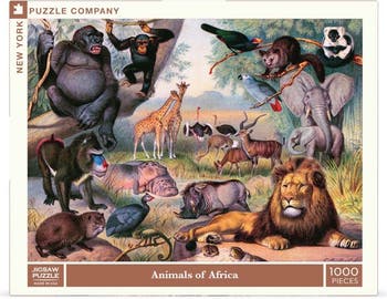Piece together the Animals of Africa in this captivating 1000 piece puzzle showcasing the diverse wildlife of Africa. This beautifully detailed vintage artwork features a magnificent array of animals, including a powerful lion, a pair of sunning hippos, a majestic gorilla, graceful giraffes, and towering elephants. Alongside them, a warthog, baboon, and many more creatures are depicted, offering a vibrant and engaging exploration of the African continent's rich fauna.