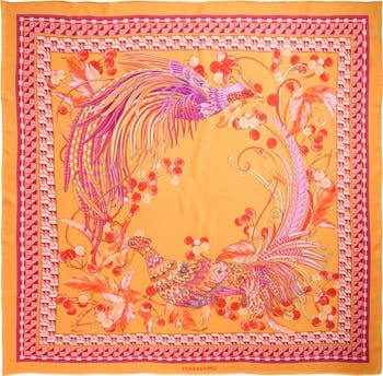 Archival motifs inspired by birds of paradise take flight in an ornate colorscape on this fluid Italian-silk scarf with an elegant solid border.