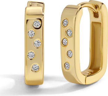Our stunning rectangular Huggies are the perfect addition to your every day wardrobe! The earrings come in gold and silver featuring a rectangular geometric shape with cascading cubic zirconia stones.