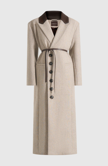 Defined by a contrasting leather collar, this longline coat introduces a refined edge to classic tailoring. Crafted from herringbone wool for a textured, elevated finish, it carries timeless appeal with modern distinction. Marble feature buttons provide a bold statement detail, while a detachable belt allows for versatile waist shaping. The result is a sleek silhouette that balances enduring elegance with contemporary refinement.