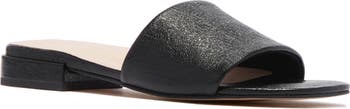 Richly textured leather enriches a Brazilian-made slide sandal featuring a minimalist profile and a podiatrist-designed footbed that offers targeted cushioning with built-in arch support.