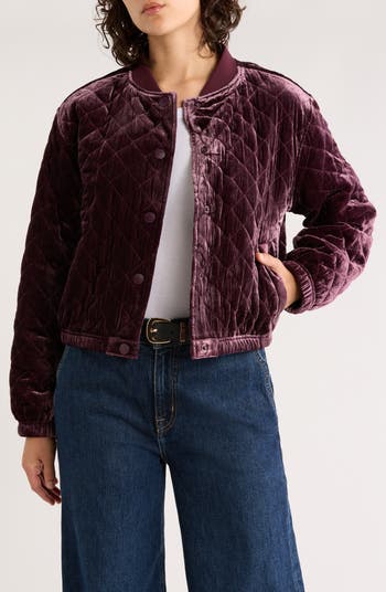 Diamond quilting adds insulation and cozy appeal to a silk-kissed velvet bomber jacket that will have you striding through the cooler seasons in soft, comfy style.