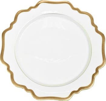 Add a touch of elegance to your dining experience with Anna's Palette, antique shaped dinnerware. Crafted from porcelain in stunning shapes, this dinnerware features a delicate scalloped gold edge for a sophisticated touch. Mix and match with other antique shaped dinnerware from Anna's Palette to create a unique and stylish table setting.