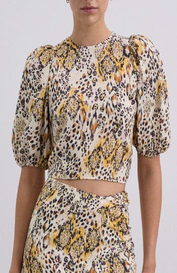 Animal print top and round neck and short wide sleeves