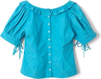 A frilly collar and sweetly tied sleeves gentle a bright button-up made from premium organic cotton.