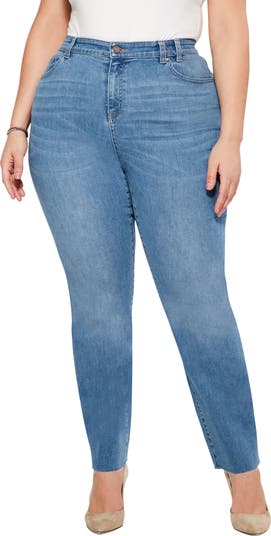 Raw hems and a faded indigo wash further the vintage vibes of mid-rise jeans made from low-stretch denim in a straight-leg fit.