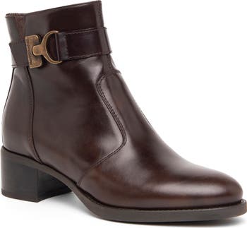 Distressed buckle hardware adds a hint of old-school attitude to a block-heel bootie shaped from burnished leather.