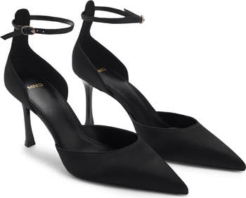 A slender ankle strap and sleek side cutouts create stunning dimension on an elegant satin d'Orsay pump framed by a pointy toe and stiletto heel.