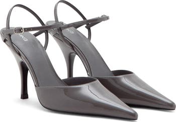 A pointy toe and slender heel balance a glossy pump fashioned with an adjustable ankle strap for a secure fit.