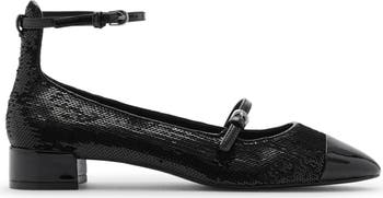 Allover sequins and a smooth patent cap toe bring delightful modern style to this ankle-strap pump.