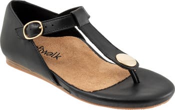 A glinting hardware accent stands out above the toe post on a versatile leather sandal featuring a cushioned footbed and adjustable strap at the ankle.